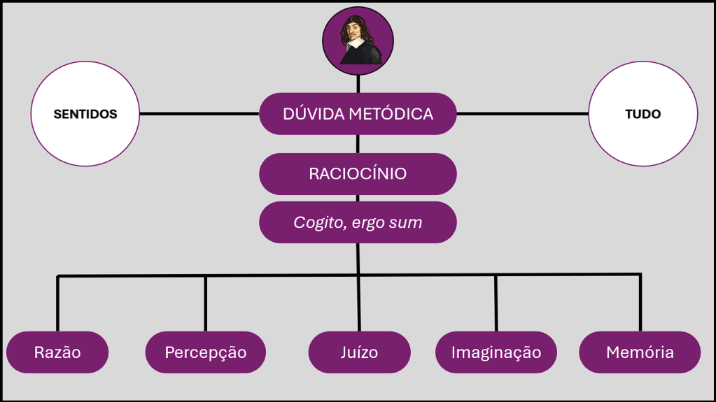 Ao duvidar de tudo (1ª meditação: dúvida metódica), ele verifica que duvidando pensa e que pensando existe (2ª meditação: o eu pensante representa a existência do ser). A própria certeza sobre a existência depende do pensamento. Sua filosofia torna-se, então, racionalista. O processo de raciocínio empregado por Descartes era basicamente a dedução. Isto é, consistia em partir de conceitos gerais até chegar às noções particulares, usando o princípio racionalista e o método lógico dedutivo do qual podemos indicar quatro princípios: jamais aceitar como verdadeira coisa alguma que não se conhecesse como evidente, e acima de qualquer dúvida; dividir cada dificuldade a ser examinada em tantas partes quanto possível e quantas fosses necessárias, a fim de resolvê-las isoladamente; ordenar os pensamentos começando pelos assuntos mais simples até o conhecimento dos mais complexos, na hierarquia em que se seguem; e por último, fazer enumerações tão exatas quanto possível e revê-las para certificar a conclusão total do problema.