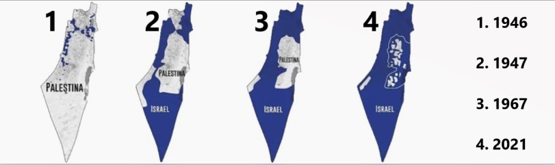 Com o fim da segunda guerra foi criada a Organização das Nações Unidas (ONU/1947), no mesmo ano a instituição aprovou uma resolução para a criação do Estado de Israel e já no ano seguinte o Estado foi criado e previa a divisão do então território da Palestina em dois Estados: um árabe e um judeu. Em termos técnicos a Palestina tem o status de Estado observador não-membro pela ONU. Ao longo dos anos a divisão do território representou a expansão de Israel, em detrimento do território palestino, conforme podemos ver nas imagens abaixo: