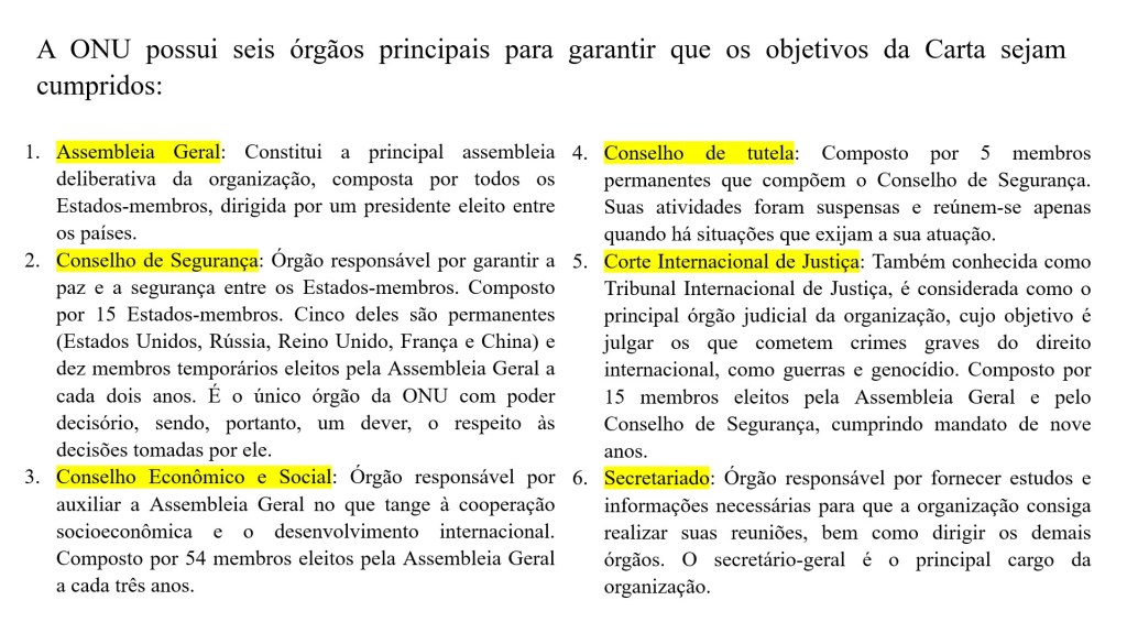 Organização das Nações Unidas (ONU) – organização intergovernamental criada para promover a cooperação internacional. Fundada em 1945 em substituição a Liga das Nações, por meio do documento de fundação conhecido como Carta das Nações Unidas: