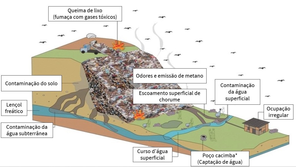 Acúmulo de resíduos de diversos lugares (residências, hospitais, indústrias, comércios etc.). O depósito fica a céu aberto. Não há critério sanitário, ou seja, a contaminação ocorre no solo, água, ar. Sem qualquer tratamento, o terreno atrai diversas doenças causadas por esse amontoado de resíduos não tratados: dengue, febre amarela, febre tifóide, cólera, disenteria, leptospirose, malária, esquistossomose, giardíase, peste bubônica, tétano e hepatite A. A população que frequenta essas locais estão ali por motivo de sobrevivência (desde coleta de matéria-prima para venda à coleta de alimentos para consumo).