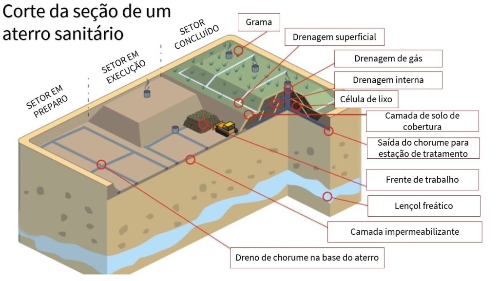 O lixo residencial e industrial é depositado em solos que receberam tratamento (impermeabilização) para isso. Isto é, nivelamento da terra e selagem da base com argila e mantar de PVC. Os aterros possuem drenagem para o chorume (líquido preto e tóxico que resulta da decomposição do lixo). Os gases liberados no processo de decomposição são captados e queimados. O principal problema dos aterros é o tempo de vida útil, muito curto (cerca de apenas duas décadas).