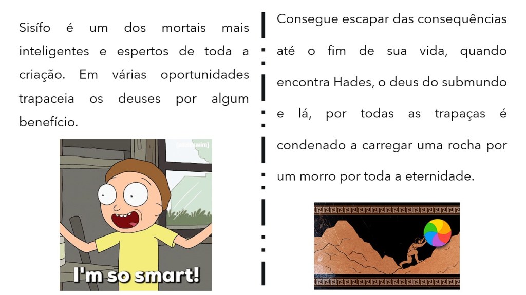Sisífo é um dos mortais mais inteligentes e espertos de toda a criação. Em várias oportunidades trapaceia os deuses por algum benefício.