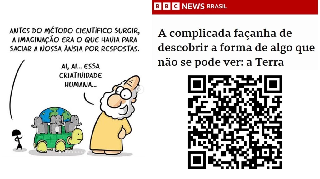 A primeira parte da tirinha faz referência a um dos mitos mais conhecidos sobre a Terra (origem e forma). Em algumas mitologias o mundo era carregado por uma tartaruga – em alguns acasos por elefantes sobre o seu casco. Quer saber mais?