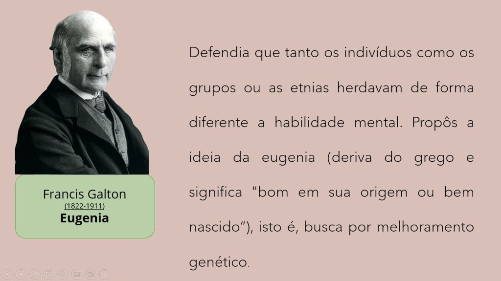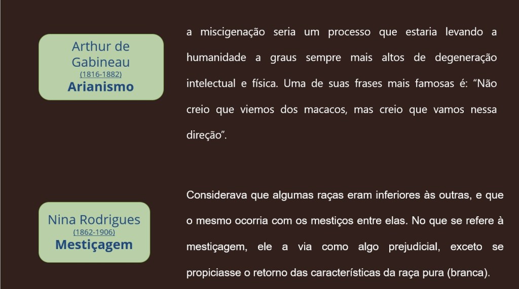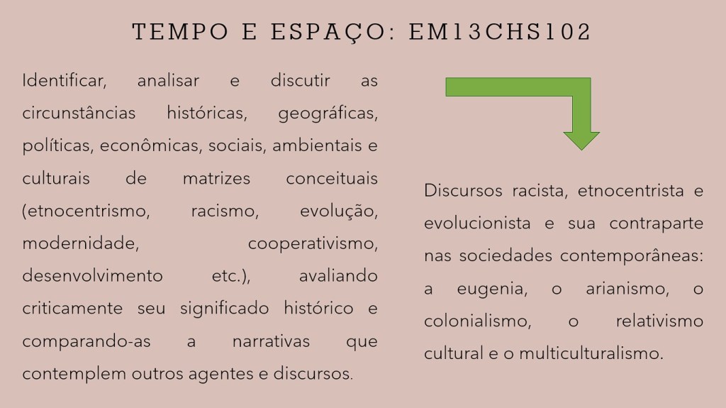 Discursos racista, etnocentrista e evolucionista e sua contraparte nas sociedades contemporâneas: a eugenia, o arianismo, o colonialismo, o relativismo cultural e o multiculturalismo.