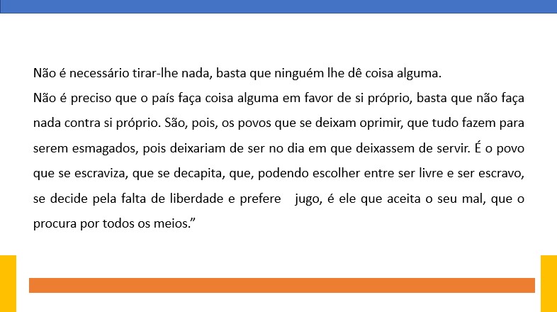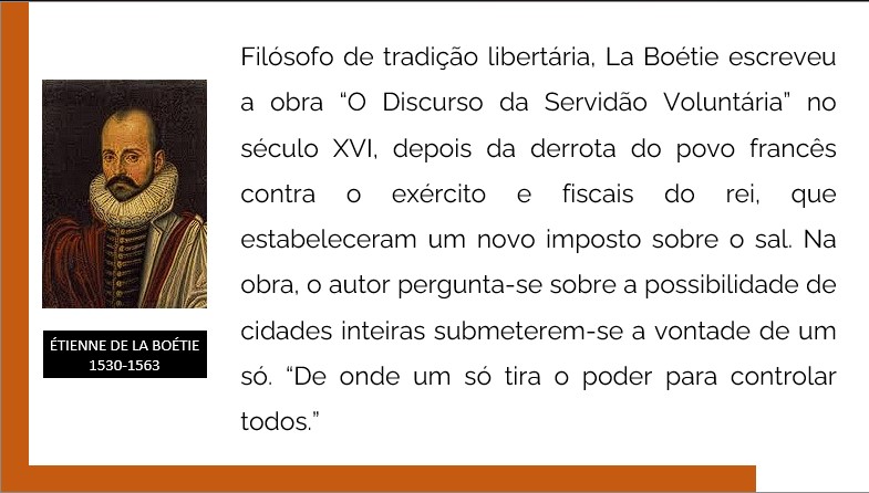 Filósofo de tradição libertária, La Boétie escreveu a obra “O Discurso da Servidão Voluntária” no século XVI, depois da derrota do povo francês contra o exército e fiscais do rei, que estabeleceram um novo imposto sobre o sal. Na obra, o autor pergunta-se sobre a possibilidade de cidades inteiras submeterem-se a vontade de um só. “De onde um só tira o poder para controlar todos.”