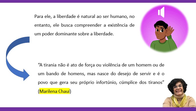 Para ele, a liberdade é natural ao ser humano, no entanto, ele busca compreender a existência de um poder dominante sobre a liberdade. Segundo a filósofa Marilena Chauí, “a tirania não é ato de força ou violência de um homem ou de um bando de homens, mas nasce do desejo de servir e é o povo que gera seu próprio infortúnio, cúmplice dos tiranos”.