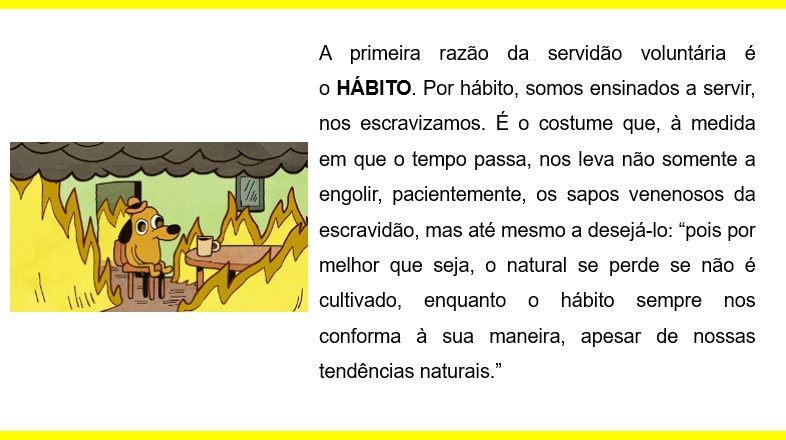 A primeira razão da servidão voluntária é o HÁBITO. Por hábito, somos ensinados a servir, nos escravizamos. É o costume que, à medida em que o tempo passa, nos leva não somente a engolir, pacientemente, os sapos venenosos da escravidão, mas até mesmo a desejá-lo: “pois por melhor que seja, o natural se perde se não é cultivado, enquanto o hábito sempre nos conforma à sua maneira, apesar de nossas tendências naturais.”