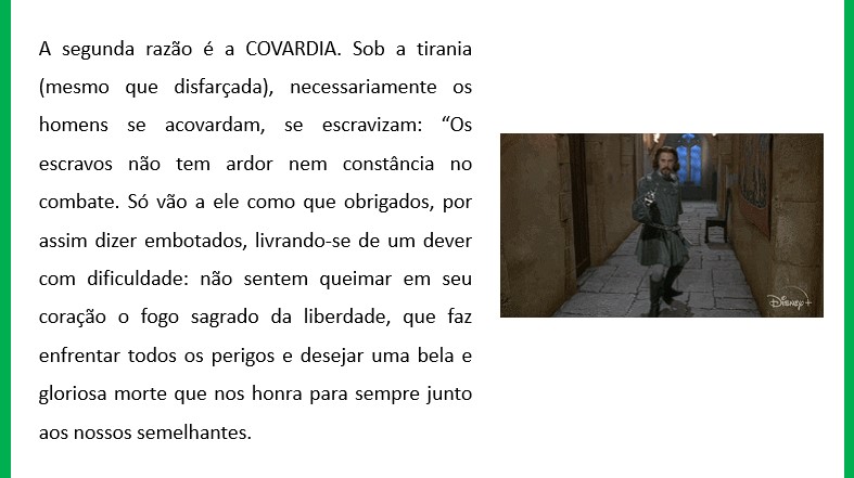 A segunda razão é a COVARDIA. Sob a tirania (mesmo que disfarçada), necessariamente os homens se acovardam, se escravizam: “Os escravos não tem ardor nem constância no combate. Só vão a ele como que obrigados, por assim dizer embotados, livrando-se de um dever com dificuldade: não sentem queimar em seu coração o fogo sagrado da liberdade, que faz enfrentar todos os perigos e desejar uma bela e gloriosa morte que nos honra para sempre junto aos nossos semelhantes.
