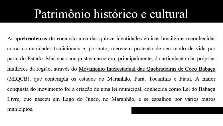 slides-aula: Quebradeiras de coco babaçu do interior do Maranhão https://videopress.com/v/ax9O6qnz?resizeToParent=1&cover=1&autoPlay=0&controls=1&loop=0&muted=0&persistVolume=1&playsinline=0&preloadContent=metadata&sbc&sbpc&sblc&useAverageColor=1 Compartilhe isso:Tweet Clique para compartilhar no WhatsApp(abre em nova janela) WhatsApp Clique para imprimir(abre em nova janela) Imprimir Clique para enviar um link por e-mail para um amigo(abre em nova janela) E-mail Curtir Carregando... Relacionado Publicado por Profa. Débora Conteúdo de Ciências Humanas e Sociais Aplicadas para o Ensino Médio Ver todos os posts de Profa. Débora