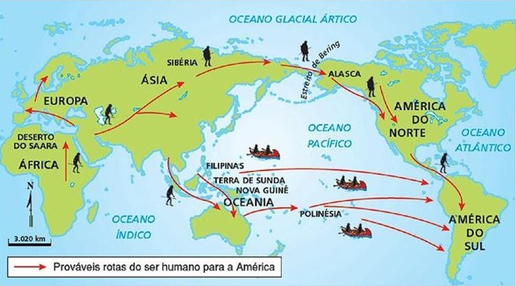 A origem do primeiro habitante da América não se encontra ainda definitivamente assentada. Afirmam alguns historiadores que o homem da América é originário do próprio território americano. Asseveram outros estudiosos que foi em virtude de movimentos migratórios oriundos do Pacífico que se operou a vinda dos seres humanos para o nosso continente, através de vias marítimas ou terrestre (estreito de Bering). Mas existem outras teorias, clique aqui para ler.