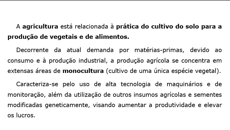 A agricultura está relacionada à prática do cultivo do solo para a produção de alimentos. Decorrente da demanda por matérias-primas, devido ao alto consumo e à produção industrial, a produção agrícola se concentra em extensas áreas de monocultura (latifúndios). Caracteriza-se pelo uso de alta tecnologia de maquinários (um dos principais motivos para o êxodo rural), além da utilização de outros insumos agrícolas e sementes modificadas geneticamente, buscando aumentar a produtividade e lucro.