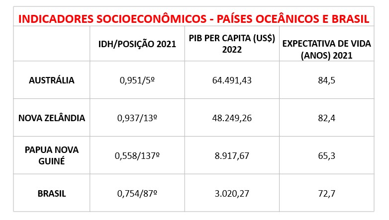 | INDICADORES SOCIOECONÔMICOS – PAÍSES OCEÂNICOS E BRASIL | |||