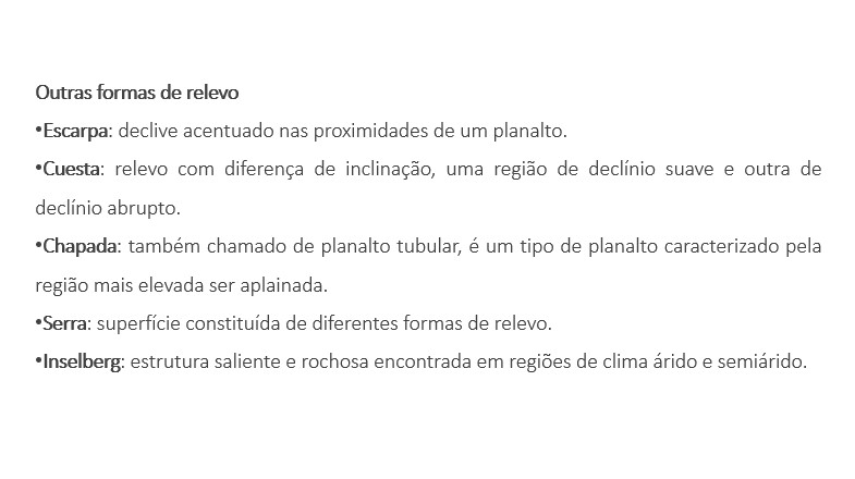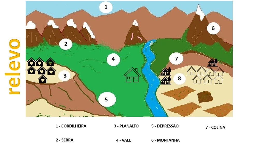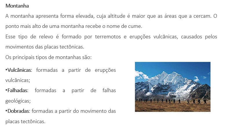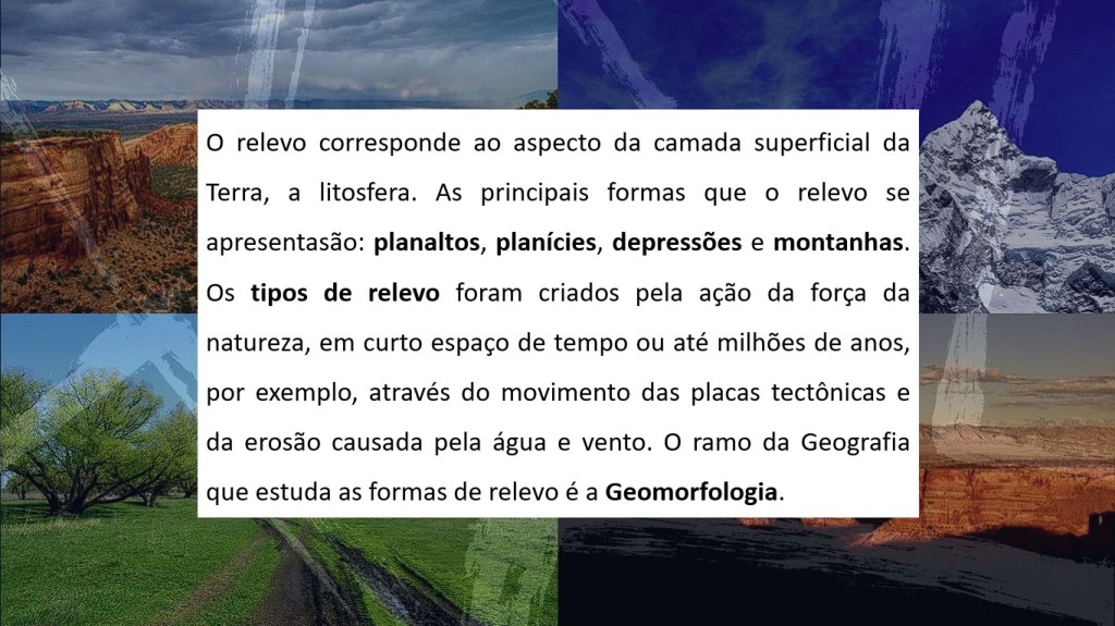 O relevo corresponde ao aspecto da camada superficial da Terra, a litosfera. As principais formas que o relevo se apresentasão: planaltos, planícies, depressões e montanhas. Os tipos de relevo foram criados pela ação da força da natureza, em curto espaço de tempo ou até milhões de anos, por exemplo, através do movimento das placas tectônicas e da erosão causada pela água e vento. O ramo da Geografia que estuda as formas de relevo é a Geomorfologia.