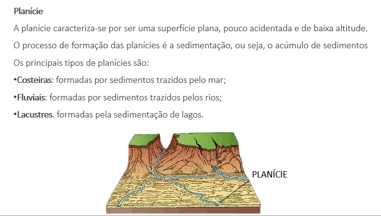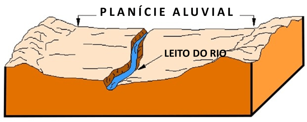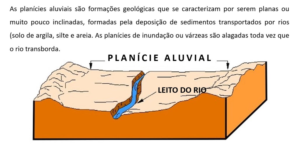 As planícies aluviais são formações geológicas que se caracterizam por serem planas ou muito pouco inclinadas, formadas pela deposição de sedimentos transportados por rios (solo de argila, silte e areia. As planícies de inundação ou várzeas são alagadas toda vez que o rio transborda.