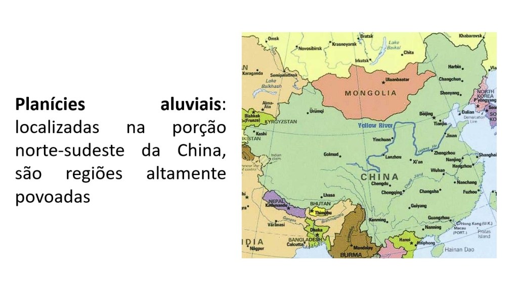 Planícies aluviais: localizadas na porção norte-sudeste da China, são regiões altamente povoadas