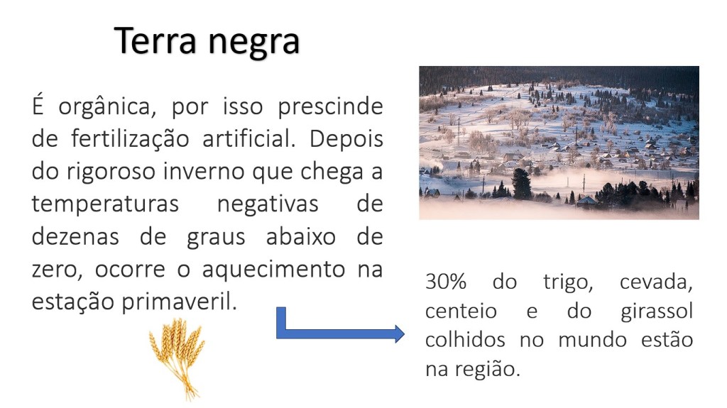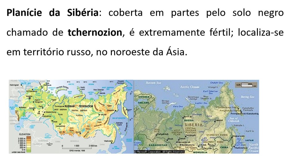 Planície da Sibéria: coberta em partes pelo solo negro chamado de tchernozion (chernossolo), é extremamente fértil; localiza-se em território russo, no noroeste da Ásia.