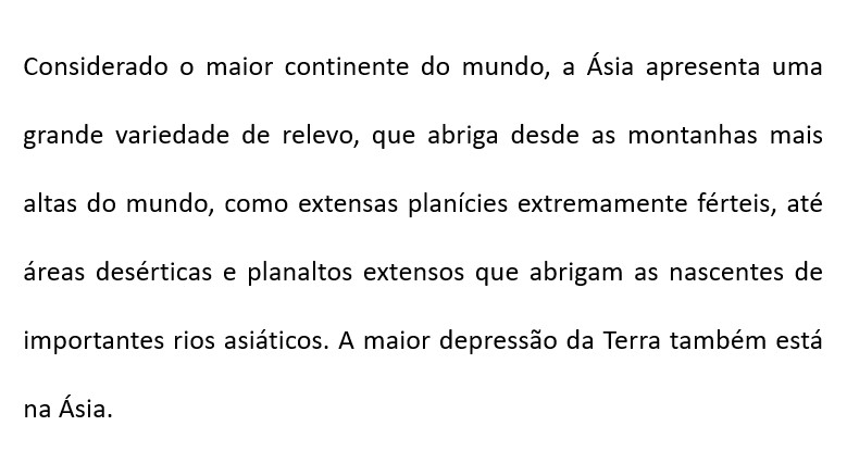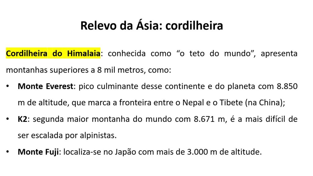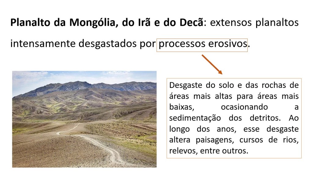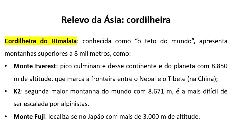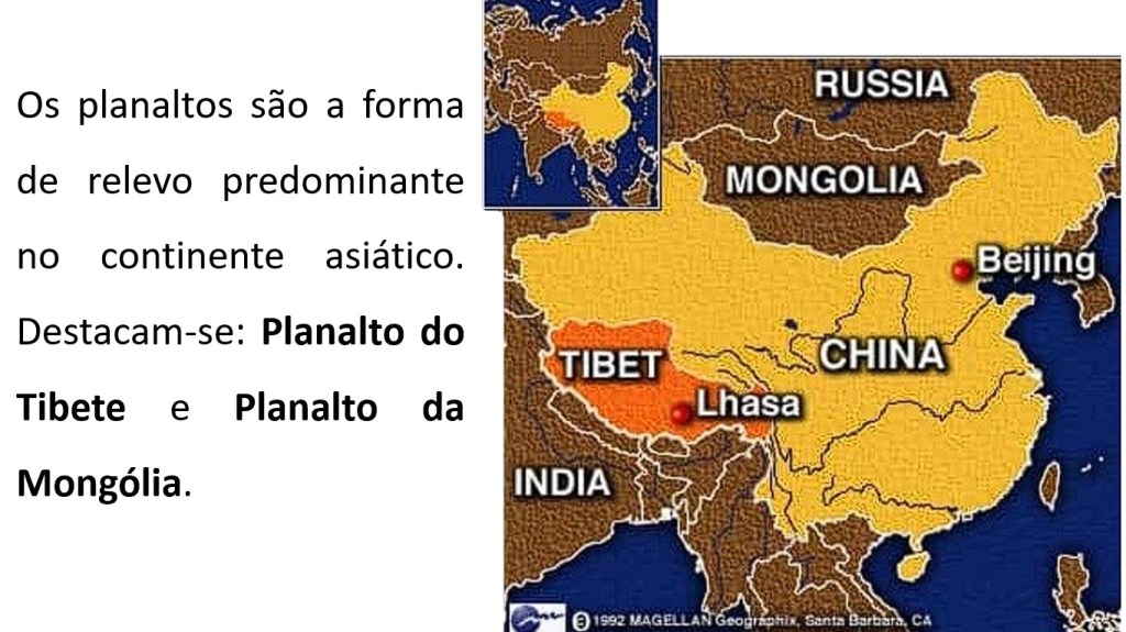 Os planaltos são a forma de relevo predominante no continente asiático. Destacam-se: Planalto do Tibete e Planalto da Mongólia.