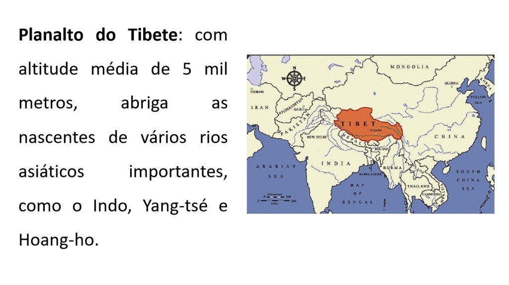 Planalto do Tibete: com altitude média de 5 mil metros, abriga as nascentes de vários rios asiáticos importantes, como o Indo, Yang-tse e Hoang-ho.