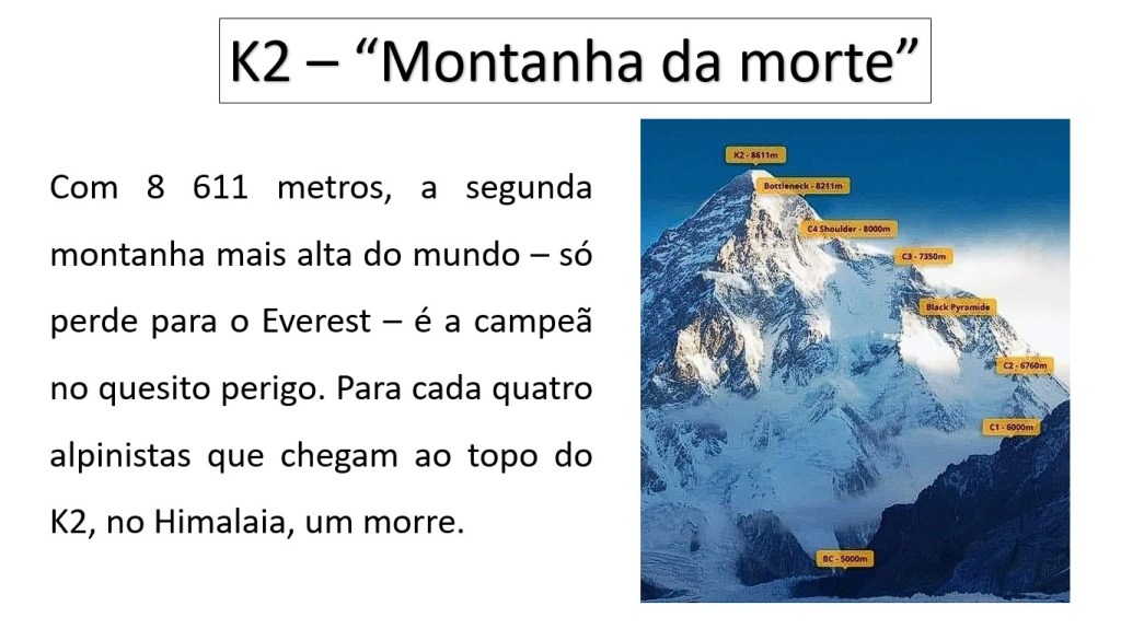 K2 – “Montanha da Morte” – Com 8.611 metros, a segunda montanha mais alta do mundo – só perde para o Everest – é a campeã no quesito perigo. Para cada quatro alpinistas que chegam ao topo do K2 um morre.