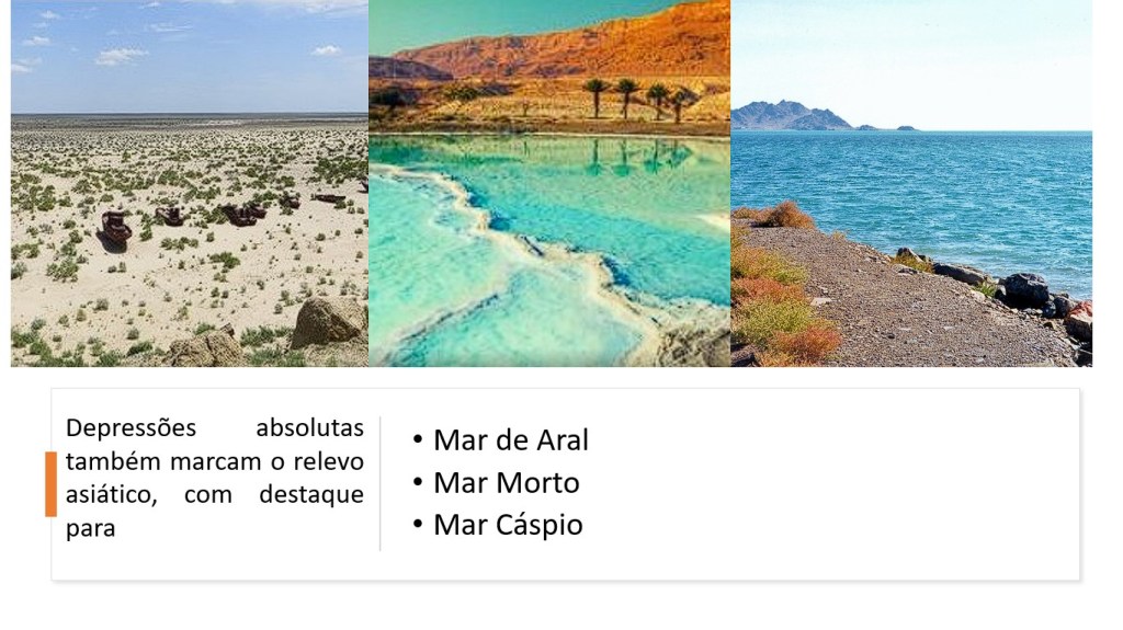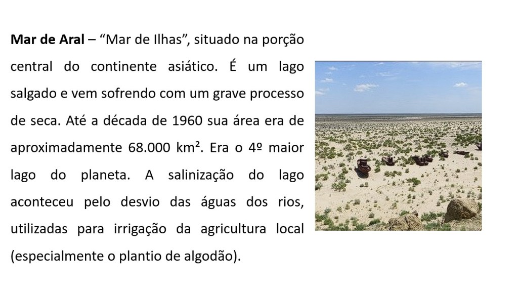 Mar de Aral – “Mar de Ilhas”, situado na porção central do continente asiático. É um lago salgado e vem sofrendo com um grave processo de seca.