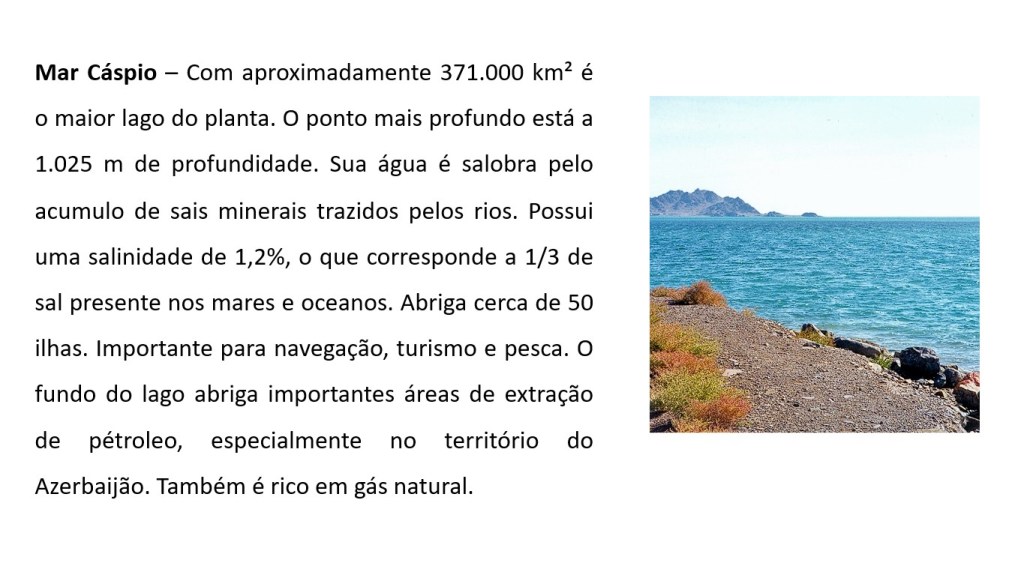 Mar Cáspio – Com aproximadamente 371.000 km² é o maior lago do planta. O ponto mais profundo está a 1.025 m de profundidade. Sua água é salobra pelo acumulo de sais minerais trazidos pelos rios. Possui uma salinidade de 1,2%, o que corresponde a 1/3 de sal presente nos mares e oceanos. Abriga cerca de 50 ilhas. Importante para navegação, turismo e pesca.
