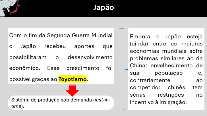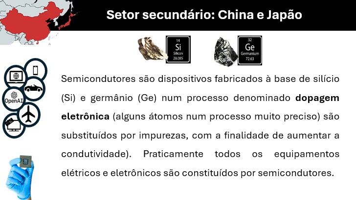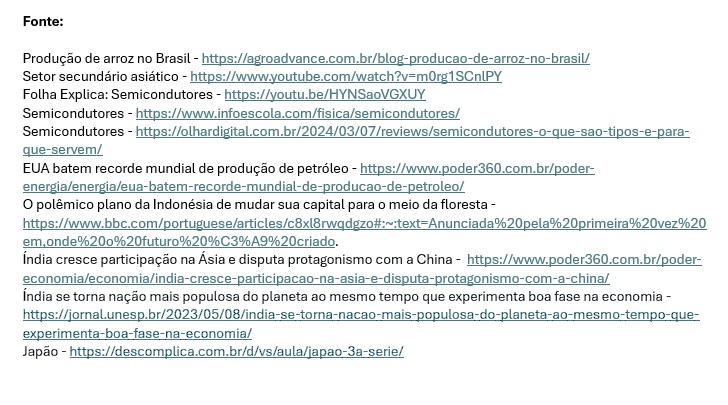 Apresentação de slides: Arquivo CMSP Aula 3 – Ásia – Setores da economiaBaixar Fontes bibliográficas e de imagens: Produção de arroz no Brasil Setor secundário asiático Folha Explica: Semicondutores Semicondutores Semicondutores Olhar digital EUA batem recorde mundial de produção de petróleo O polêmico plano da Indonésia de mudar sua capital para o meio da floresta Índia cresce participação na Ásia e disputa protagonismo com a China Poder 360 – Índia se torna nação mais populosa do planeta ao mesmo tempo que experimenta boa fase na economia Descomplica – Japão Compartilhe isso:Tweet Clique para compartilhar no WhatsApp(abre em nova janela) WhatsApp Clique para imprimir(abre em nova janela) Imprimir Clique para enviar um link por e-mail para um amigo(abre em nova janela) E-mail Curtir Carregando... Relacionado Publicado por Profa. Débora Conteúdo de Ciências Humanas e Sociais Aplicadas para o Ensino Médio Ver todos os posts de Profa. Débora