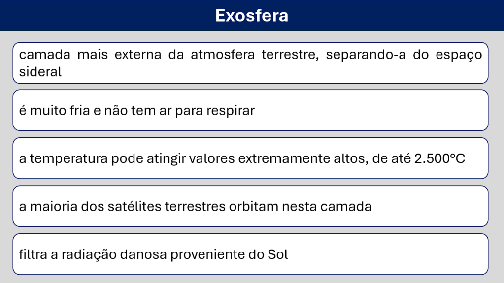 Camadas da atmosfera terrestre Características de cada camada: Arquivo CMSP Aula 1 – Climatologia e meteorologiaBaixar Compartilhe isso:Tweet Clique para compartilhar no WhatsApp(abre em nova janela) WhatsApp Clique para imprimir(abre em nova janela) Imprimir Clique para enviar um link por e-mail para um amigo(abre em nova janela) E-mail Curtir Carregando... Relacionado Publicado por Profa. Débora Conteúdo de Ciências Humanas e Sociais Aplicadas para o Ensino Médio Ver todos os posts de Profa. Débora